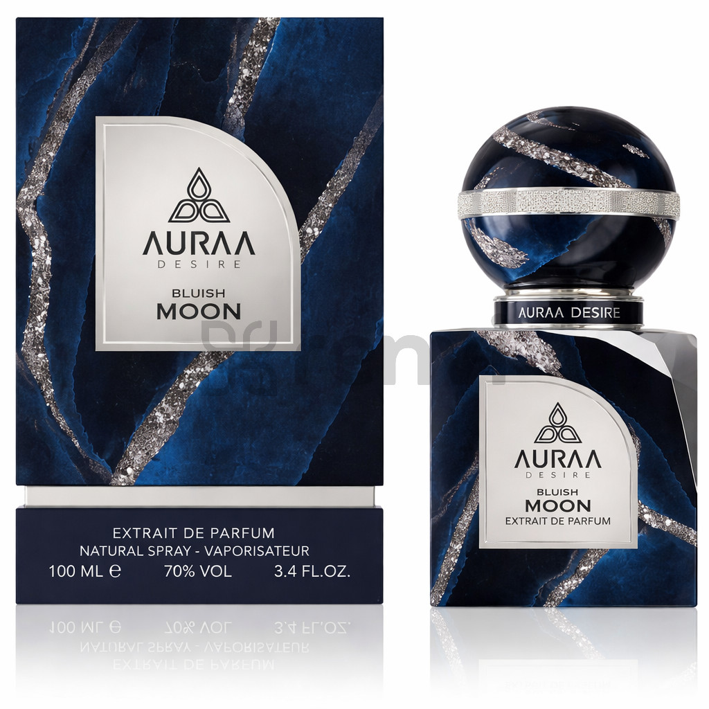 Az Auraa Desire Bluish Moon (férfi / gyakran unisexként is említik) egy borostyános–fás karakterű extrait, ami friss, fűszeres rajttal indít. A nyitányban a bergamott tiszta citrusosságát a kardamom aromás, enyhén pikáns fűszere emeli ki, így az első benyomás egyszerre üde és elegáns. A szívben a borostyán meleg, balzsamos érzetet ad, amit fűszeres jegyek tesznek határozottabbá és férfiasabbá. A lecsengésben a vanília lágy édessége simul össze a fás akkordokkal és a visszatérő borostyános tónusokkal, így tartósan meleg, komfortos aurát hagy a bőrön. Összhatásában egy modern, „clean + warm” illat, ami különösen jól áll esti programokhoz és hűvösebb időben.