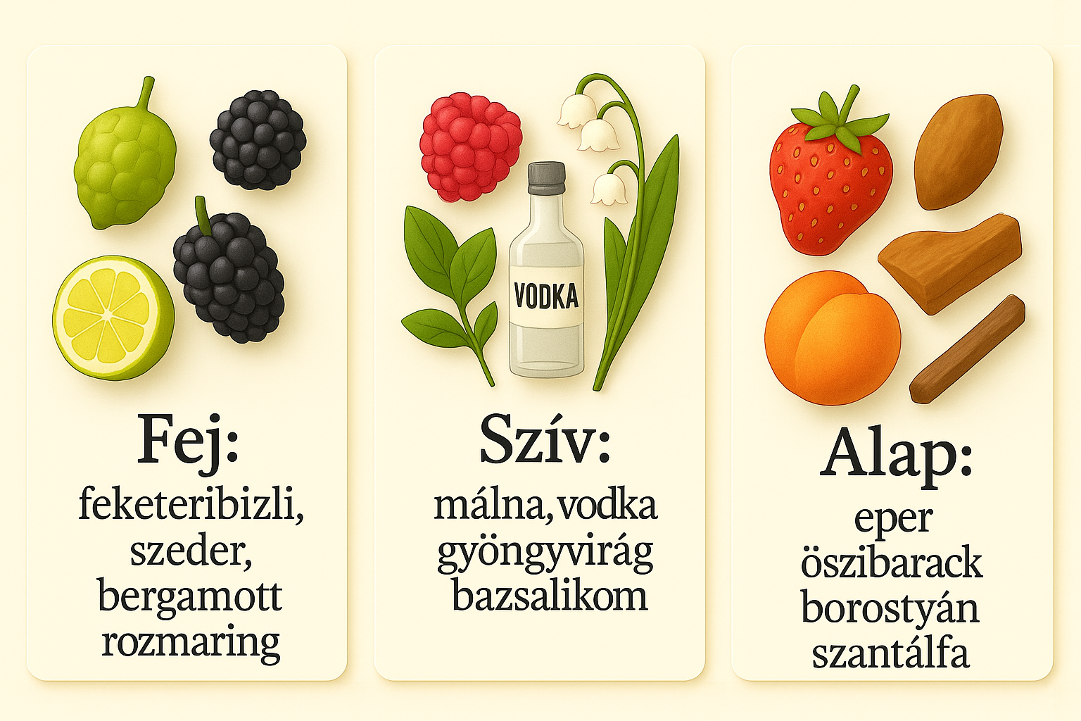 Fej: feketeribizli, szeder, bergamott, rozmaring